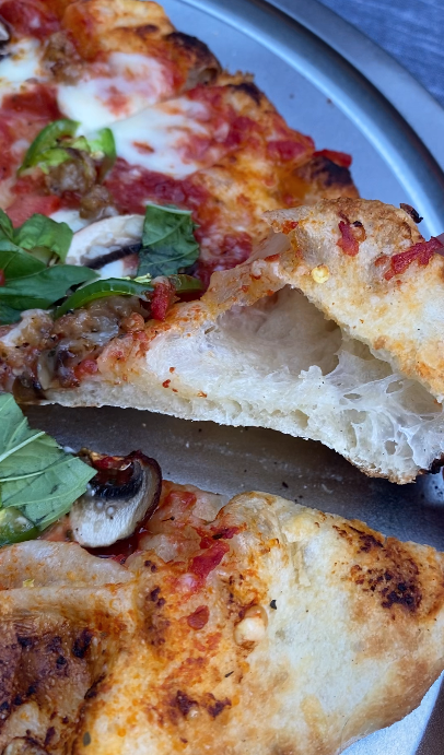 Where the stromboli and muffaletta meet. Our amazing dough folded and baked then loaded with provolone, fresh mozzarella, uncured pastrami, melted again and topped with tomato slices, onion slivers, romano leaves and jalapeno (optional).